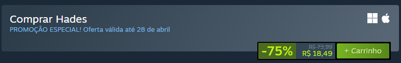 A promoção faz parte de uma campanha especial da Steam e tem prazo limitado. Após o dia 28 de abril, o jogo retorna ao seu valor normal, o que reforça o senso de urgência para aproveitar o desconto.